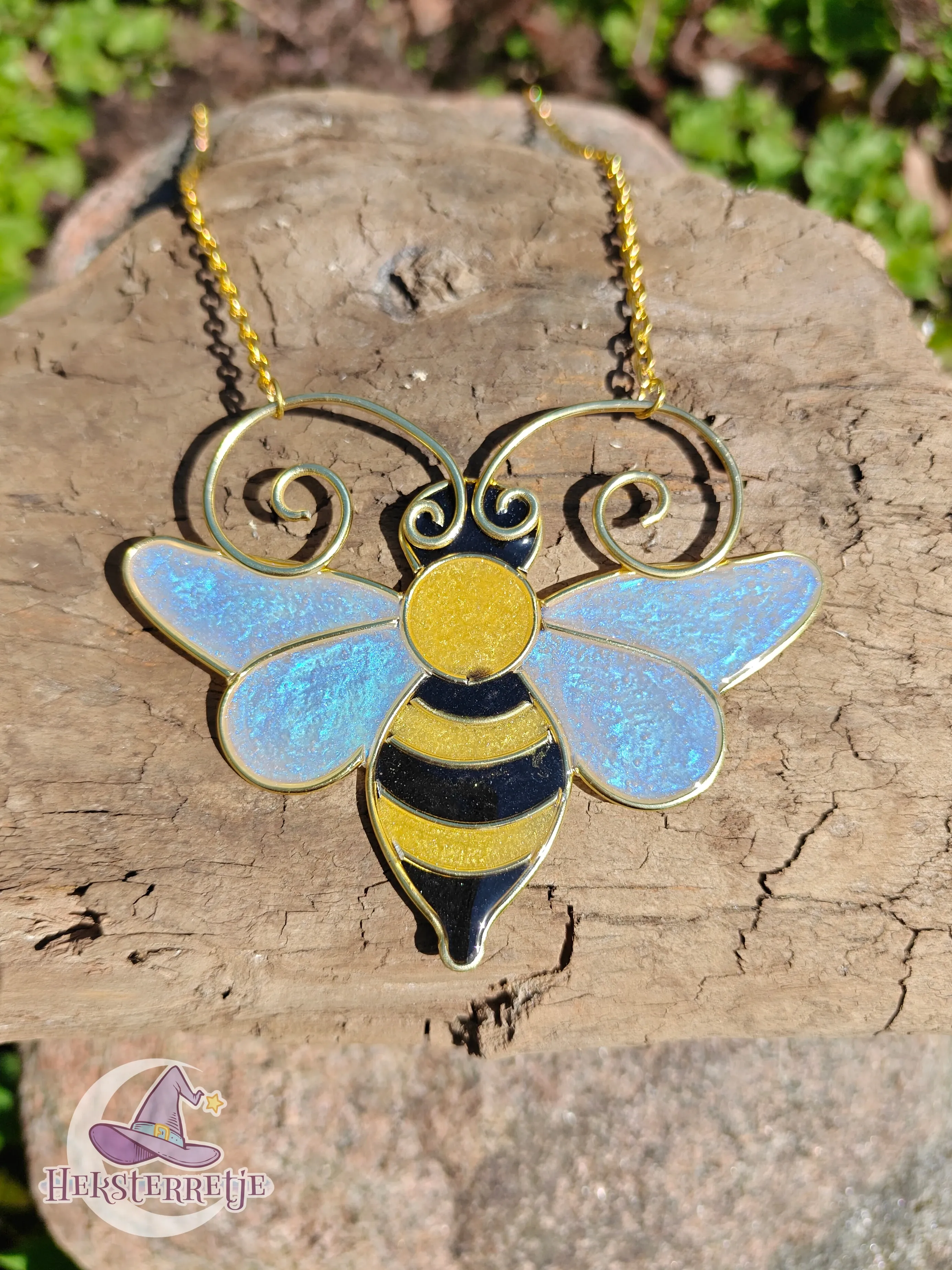 Hanger in de vorm van een bij, gemaakt van hars en aluminiumdraad aan een metalen ketting van ± 50 cm lang.