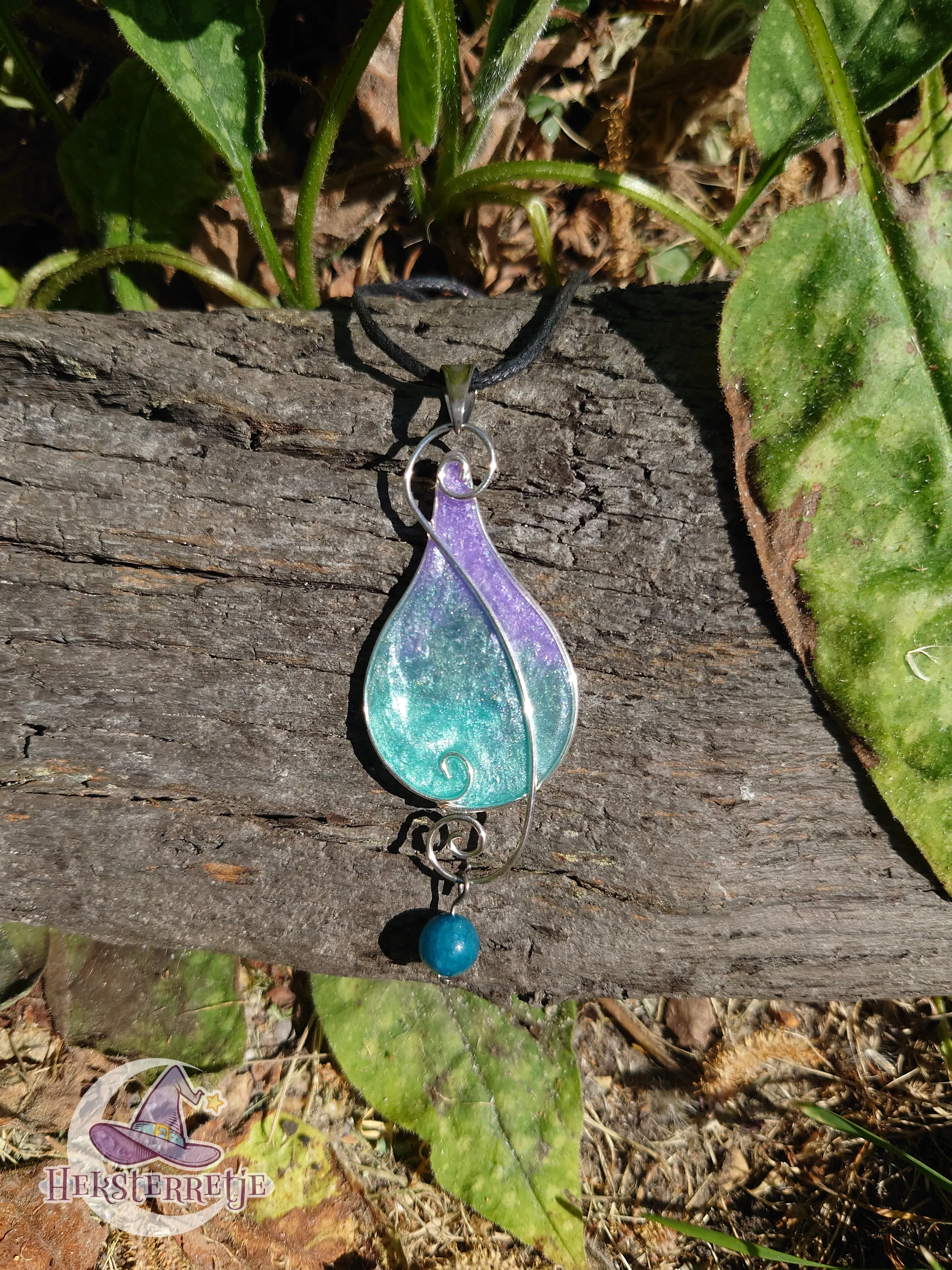 Mooie hanger in elvenstijl gemaakt van hars en artistic wire met een kraal van blauwe apatiet. De ketting is ± 50 cm gewaxt katoen.