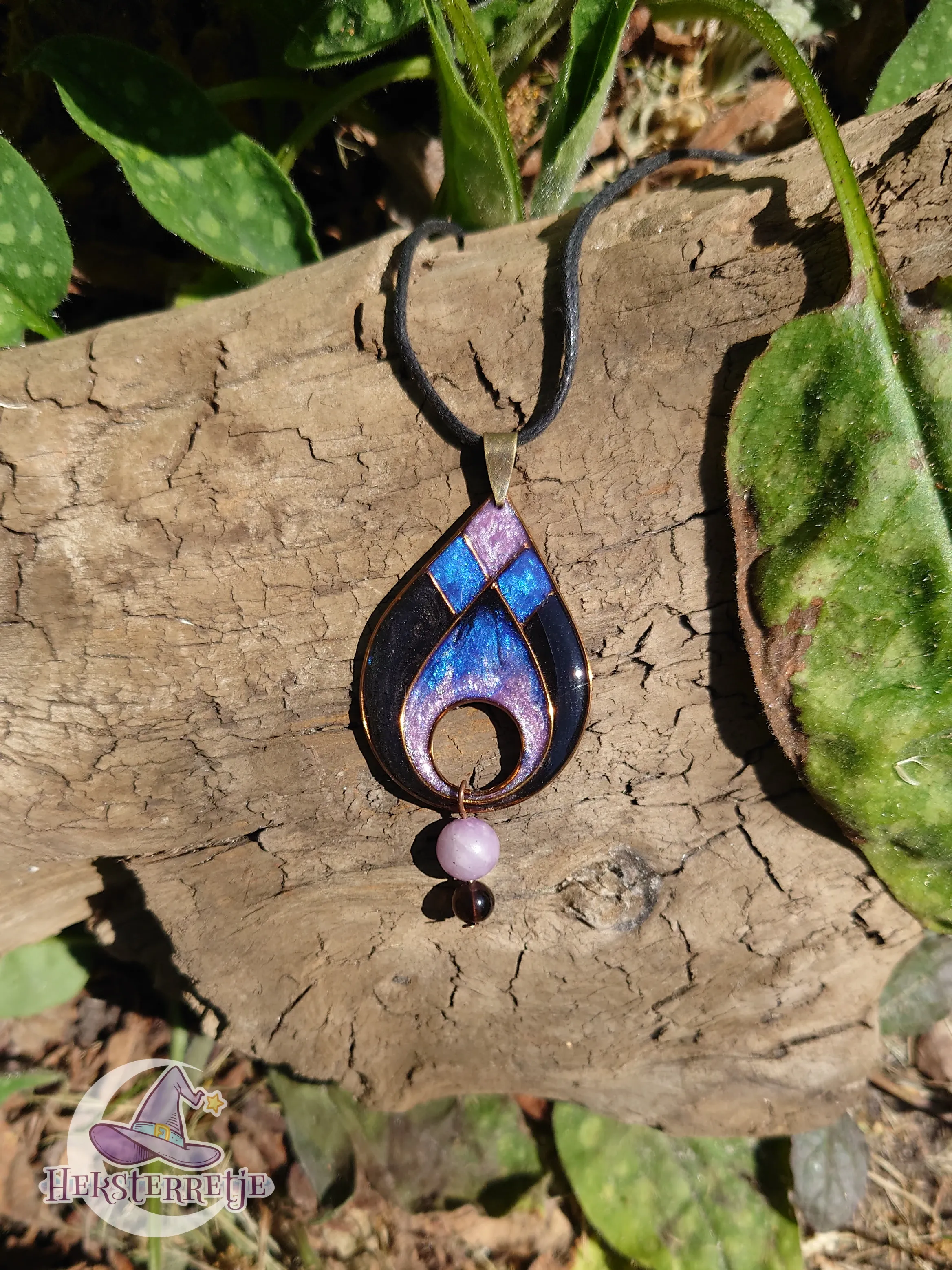 Magische ketting van hars en bronzen artistic wire met lila jaspis & obsidiaan kralen aan een ketting van ± 50 cm gewaxt katoen.