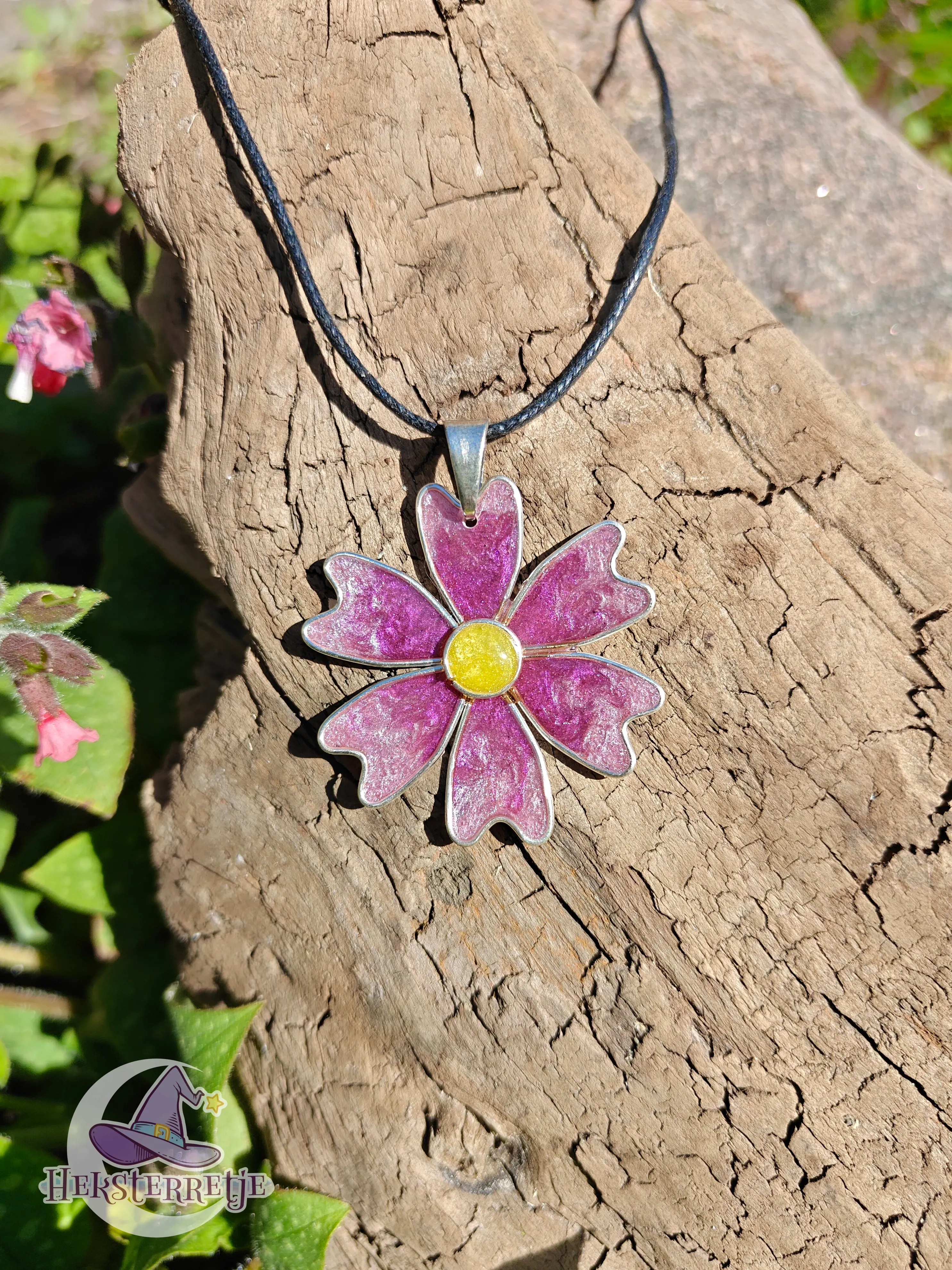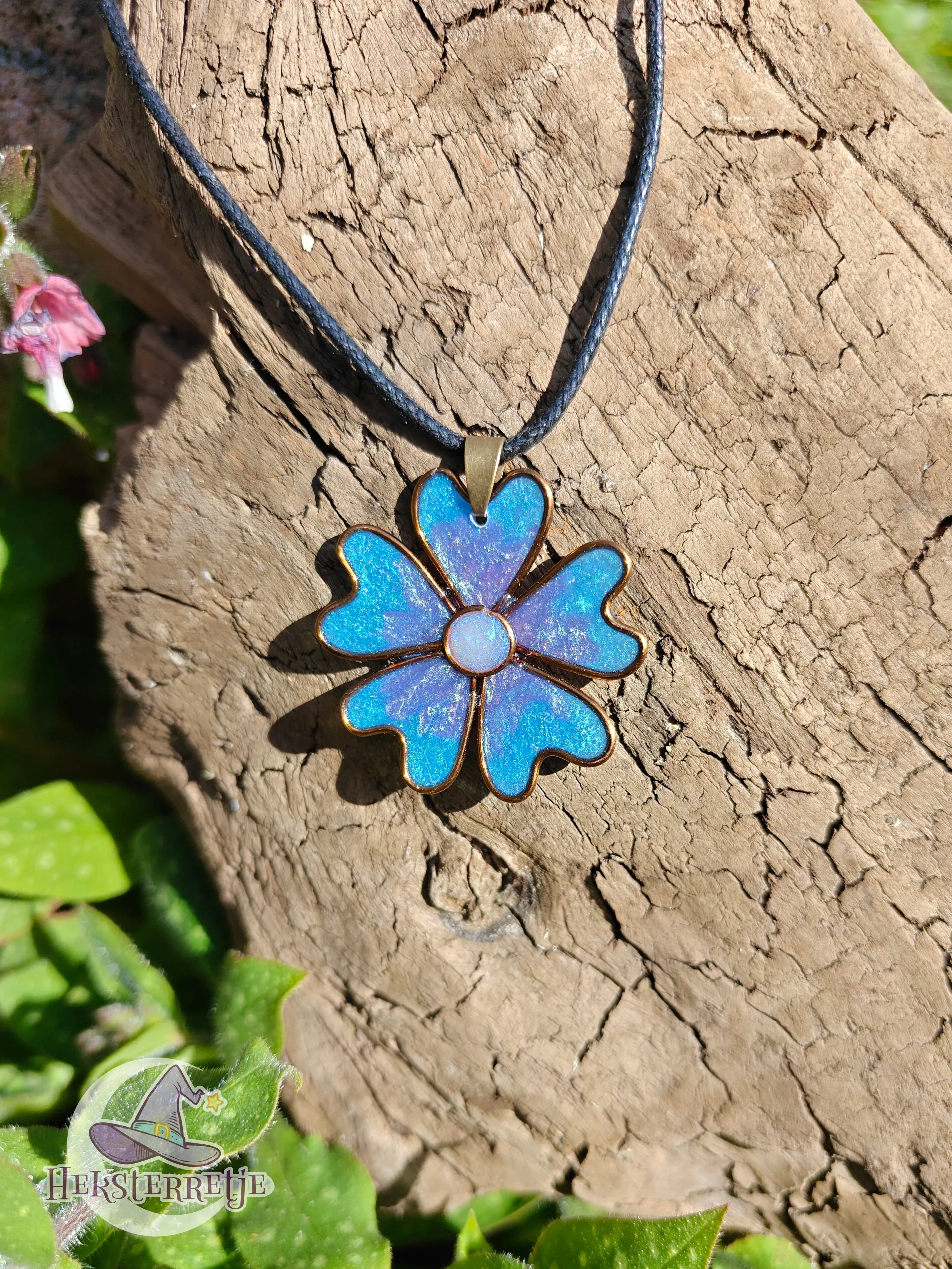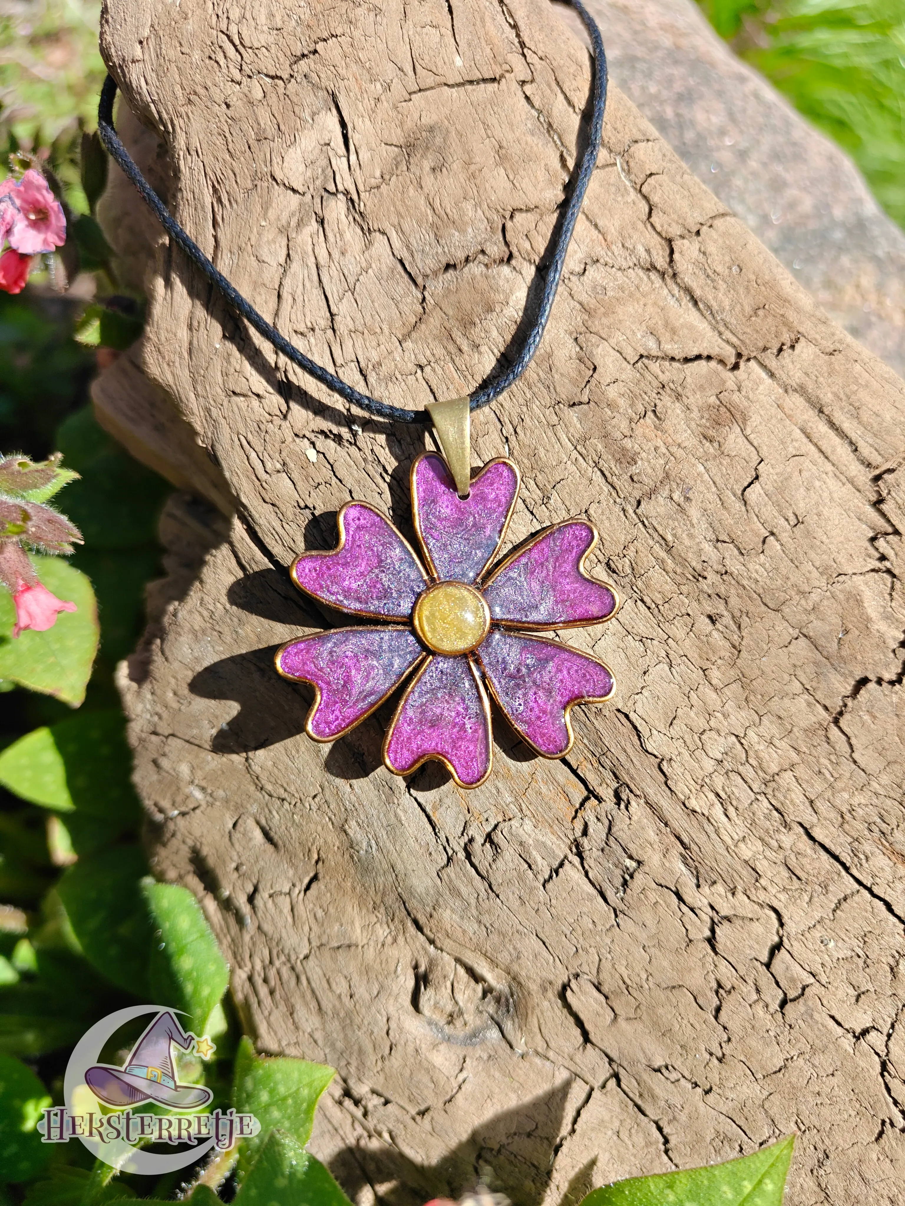 Sierlijke hanger in de vorm van een bloem, gemaakt van hars en artistic wire/24K verguld koperdraad aan een ketting van ± 50 cm gewaxt katoen.