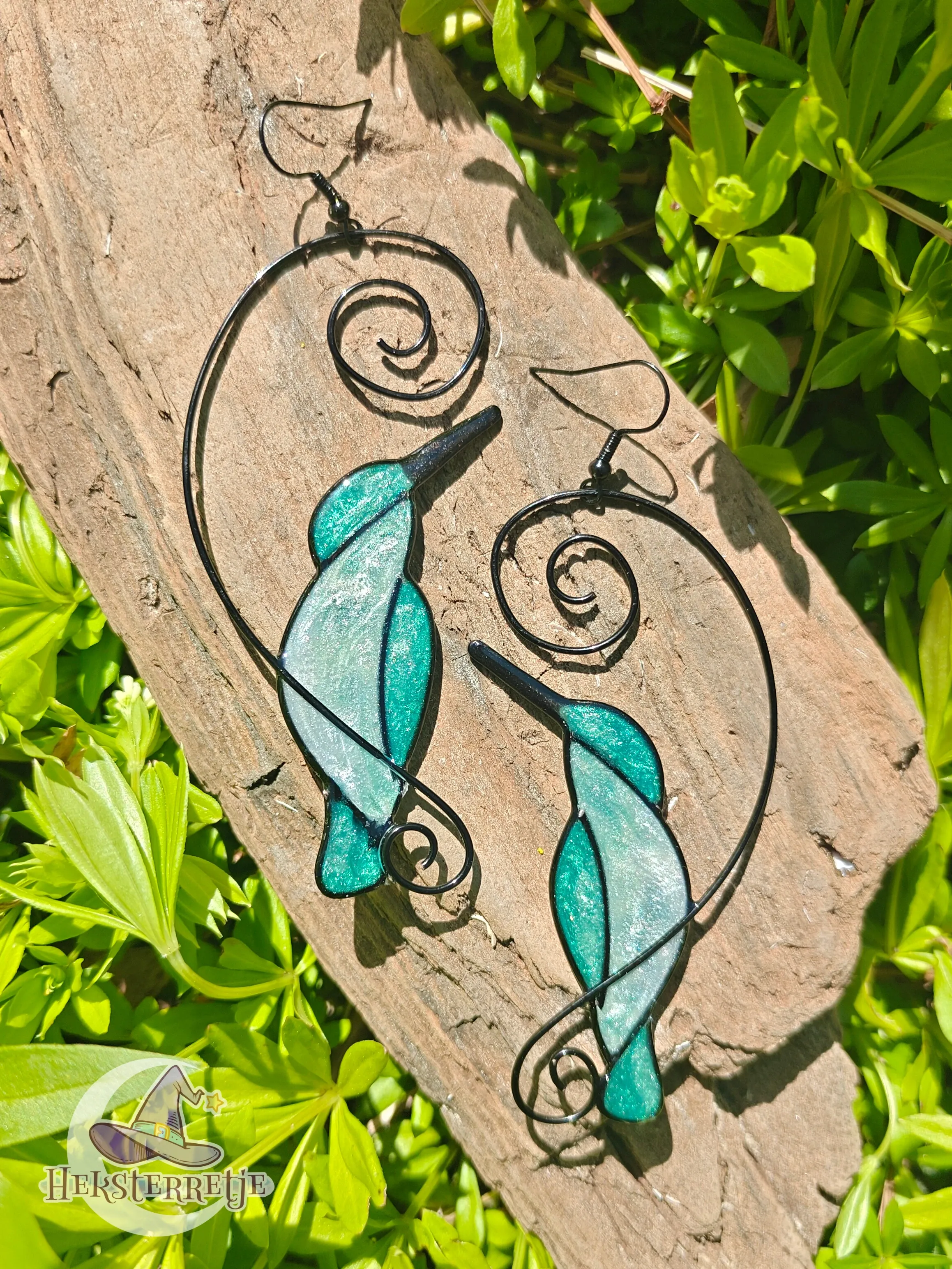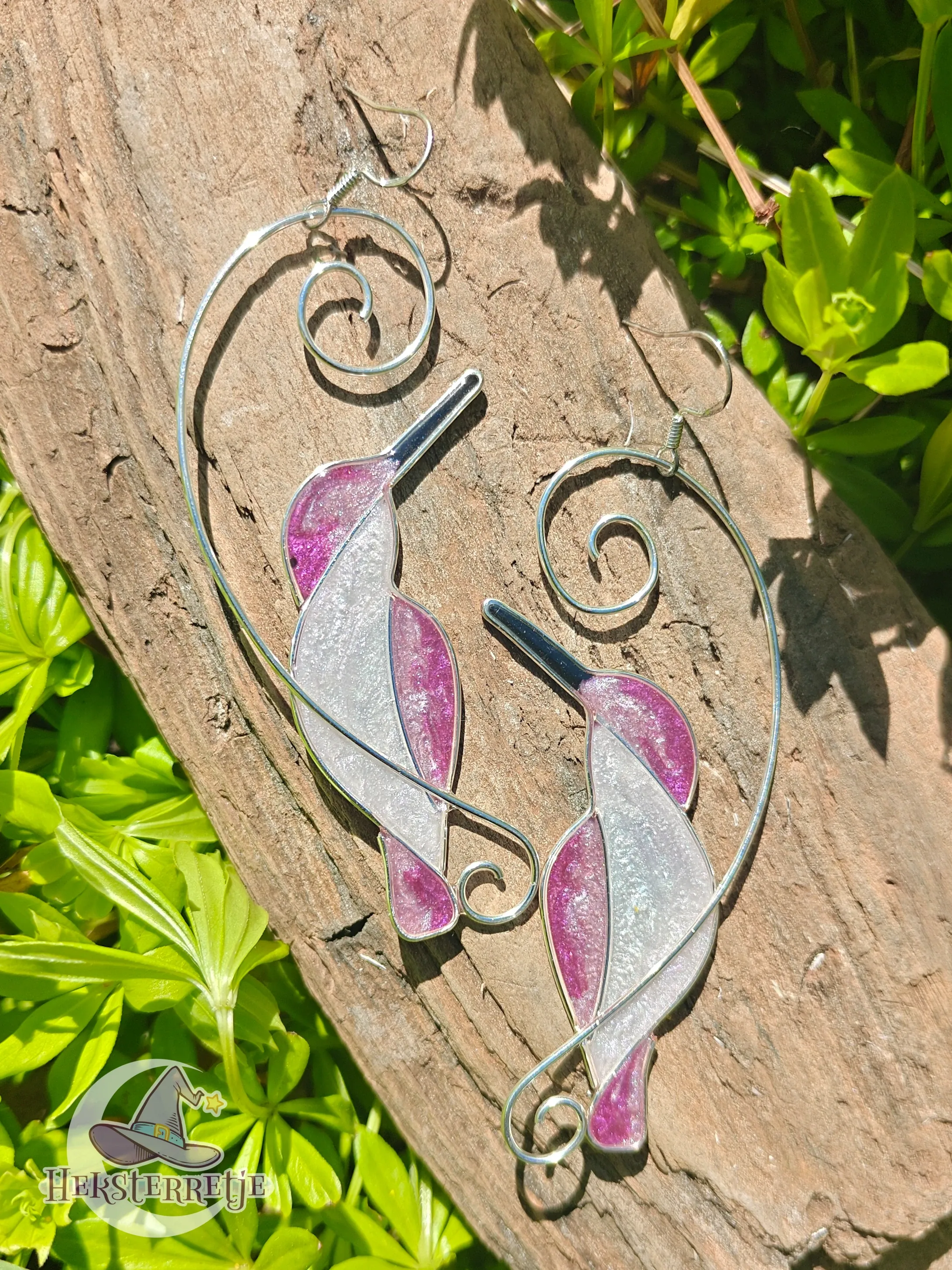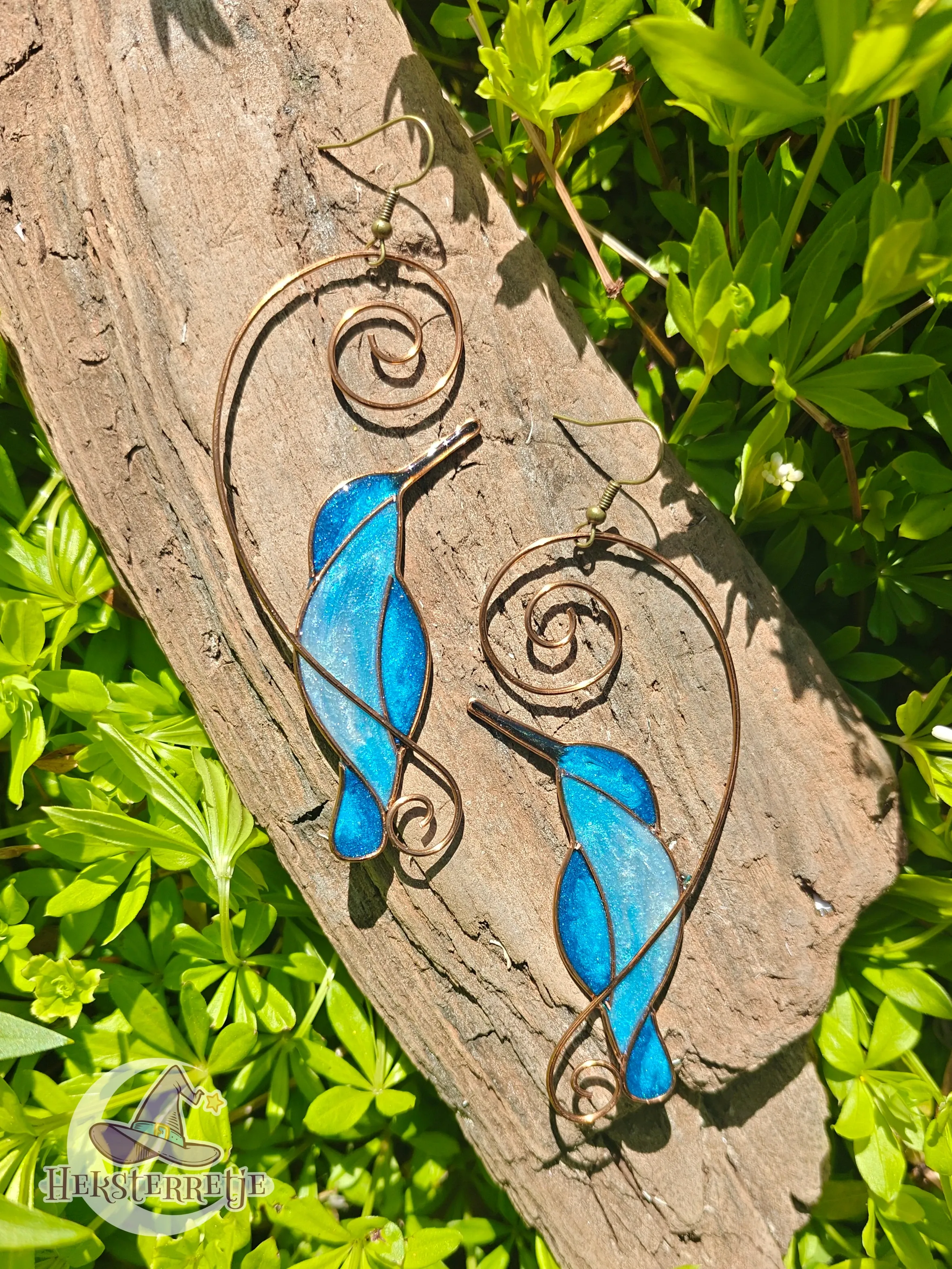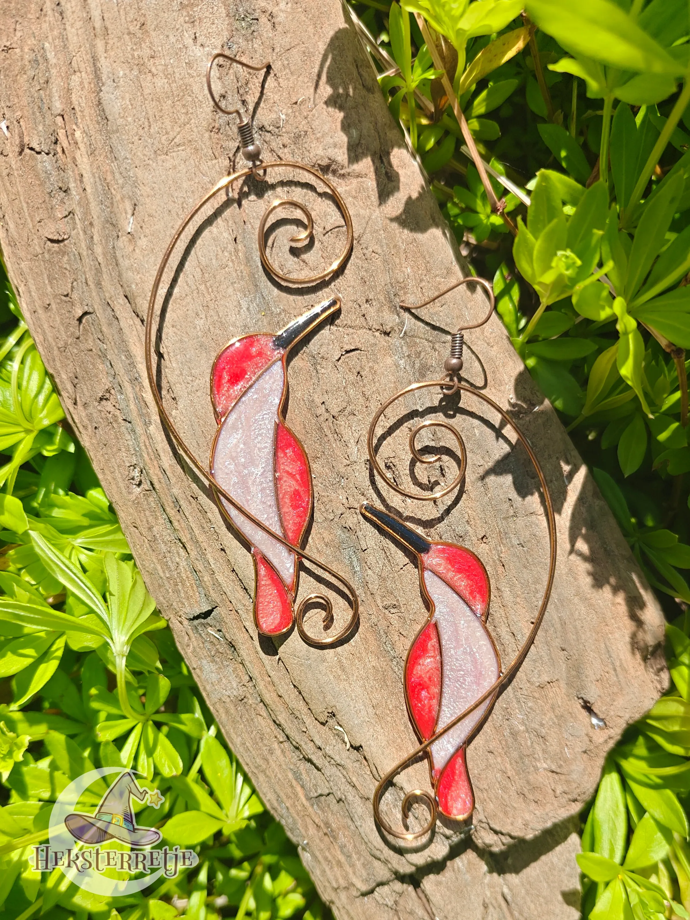 Sierlijke vogelpaartjes als oorbellen, gemaakt van hars en artistic wire.