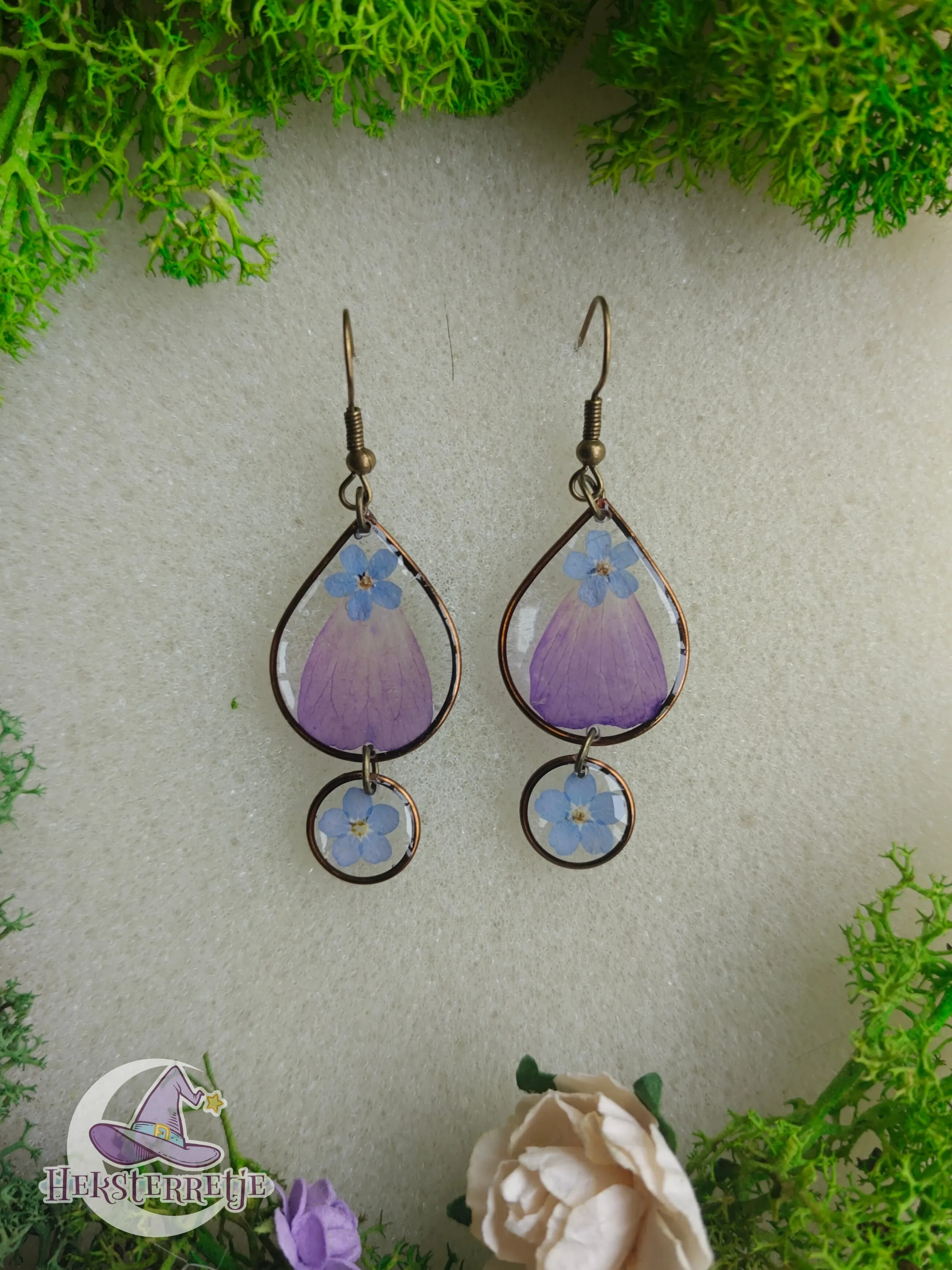 Prachtige oorbellen van hars en bronzen artistic wire met gedroogde vergeet-mij-nietjes en geranium.