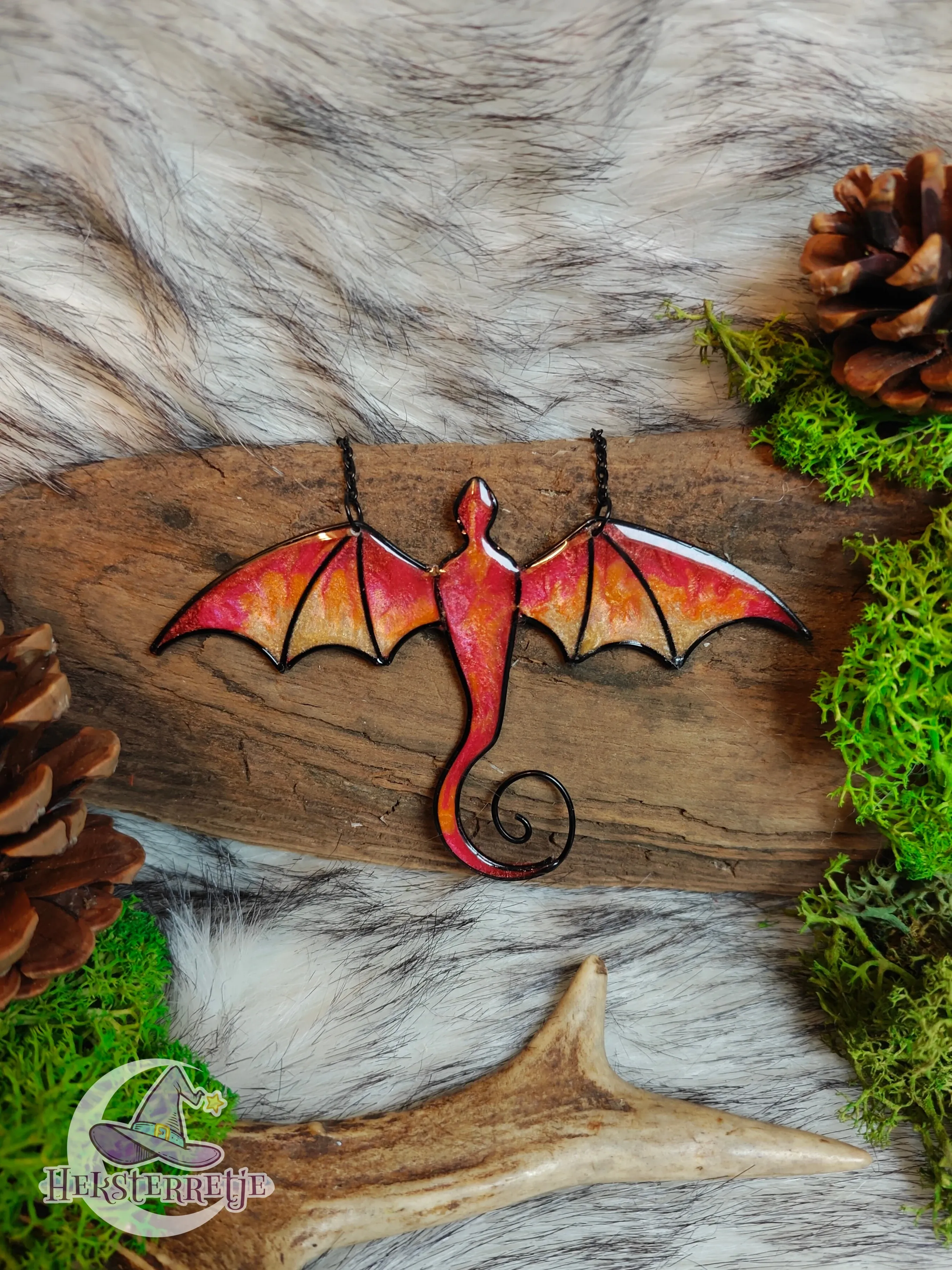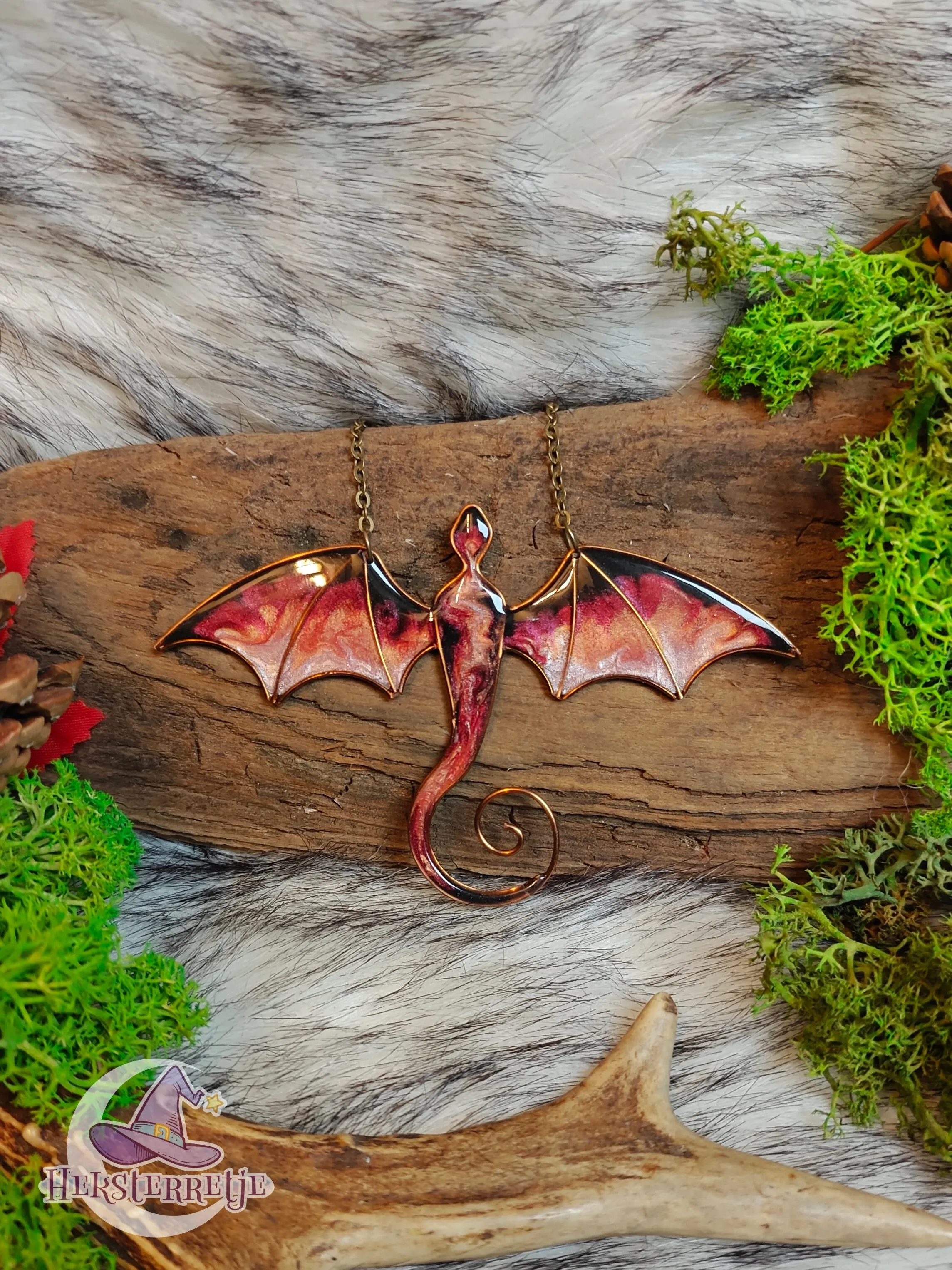 Draakje van hars en zilveren/bronskleurig artistic wire aan een metalen ketting van ± 50 cm.