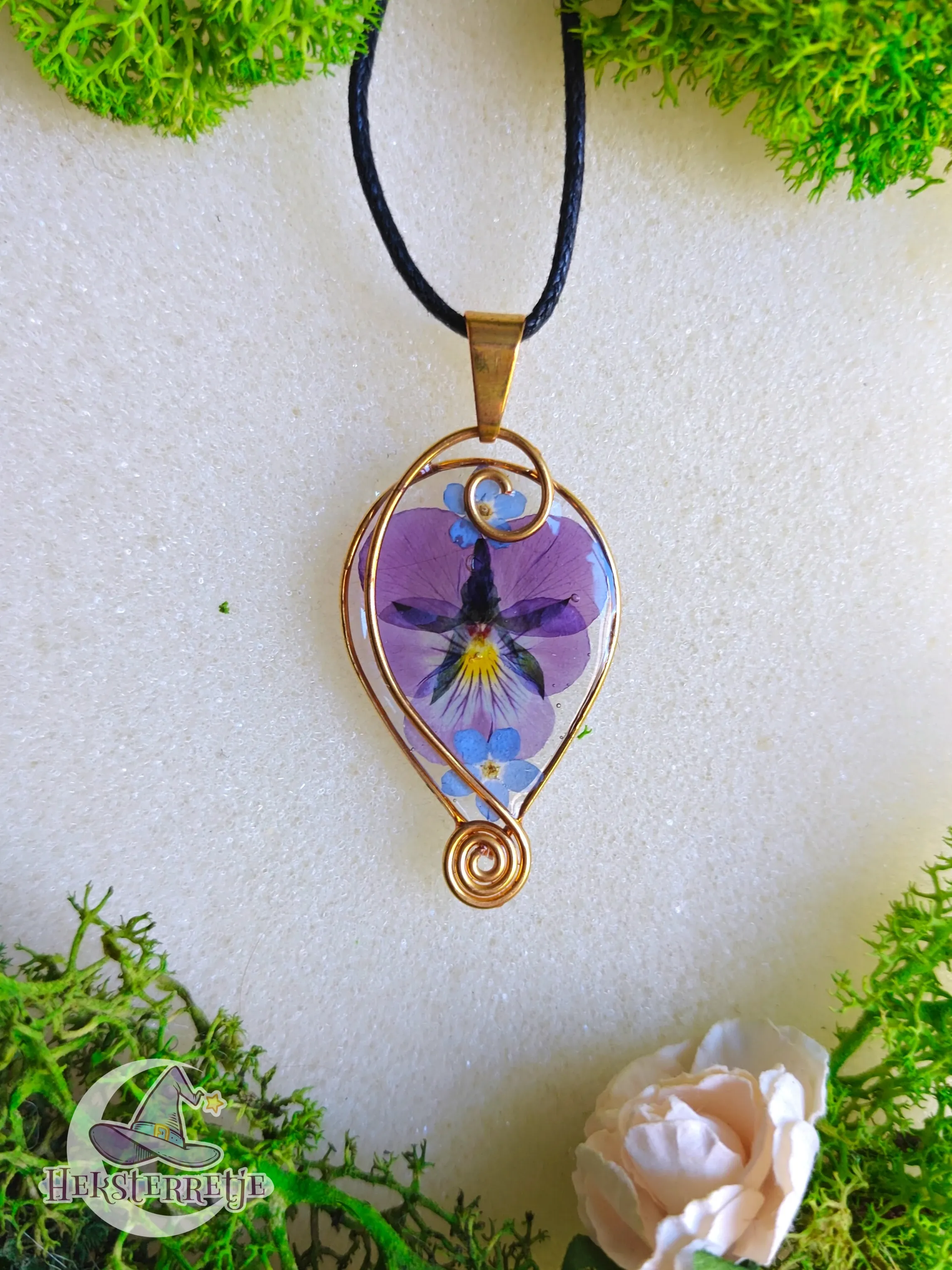 Prachtige bloemenhanger in elvenstijl gemaakt van hars en 24K verguld koperdraad met een viooltje & vergeet-mij-nietjes.