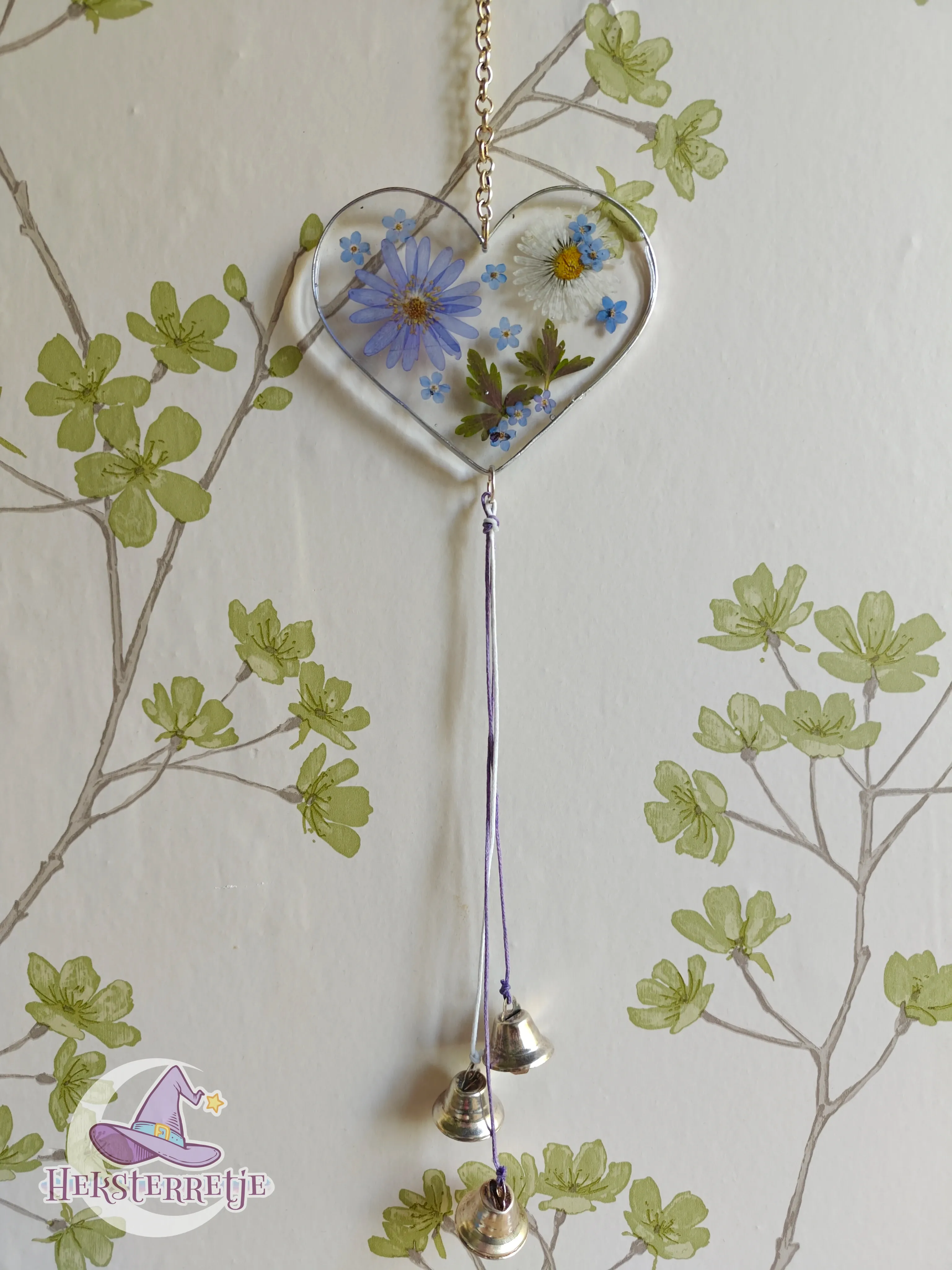 Een combinatie van een prachtige handgemaakt hart met gedroogde bloemen en witches bells.