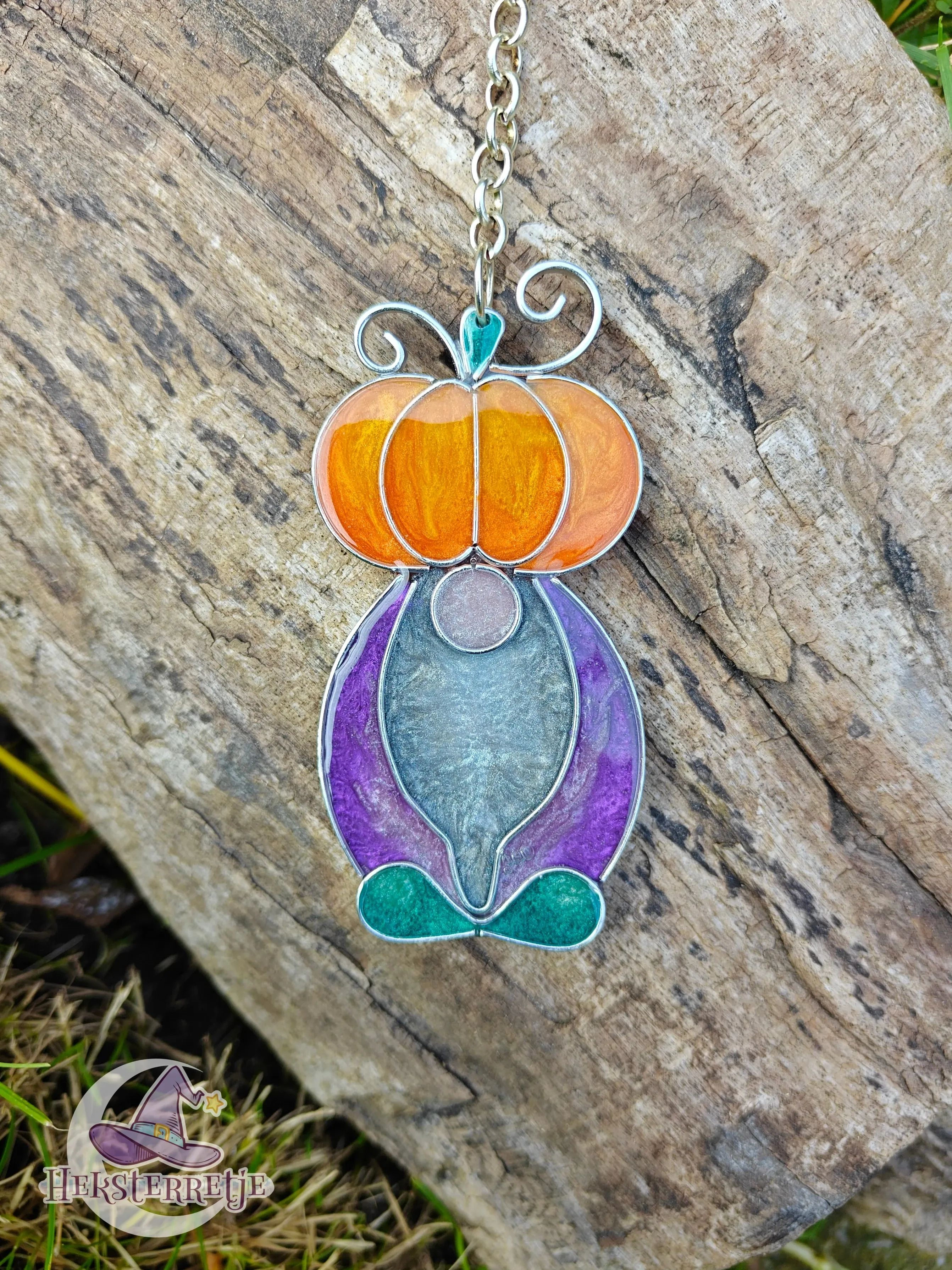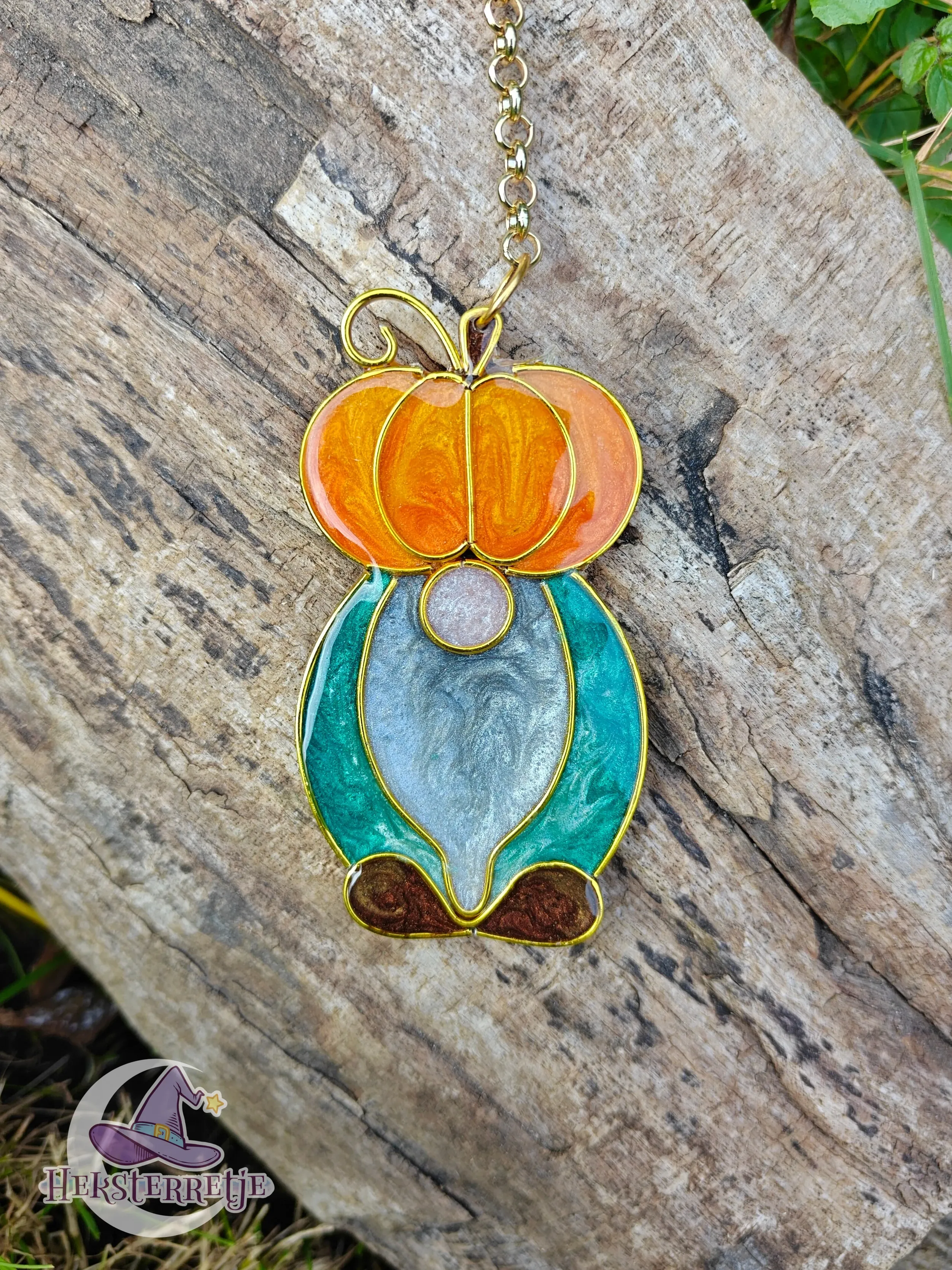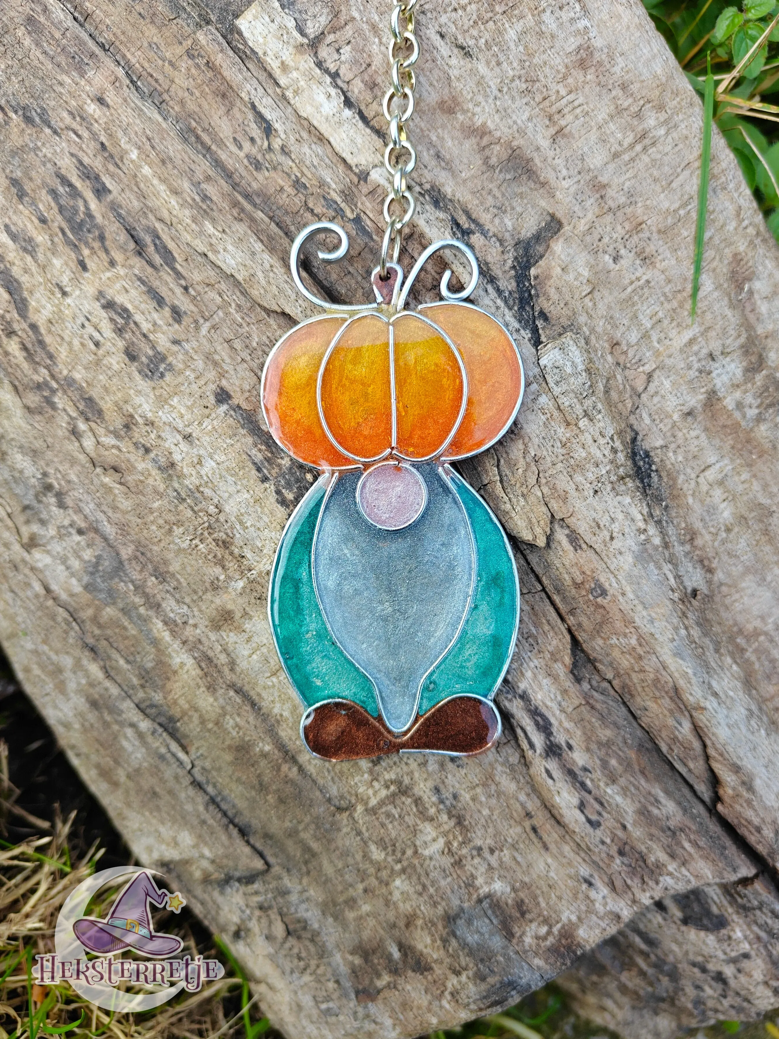 Leuke herfstelijke Tomtes met een pompoen! Gemaakt van hars en aluminium draad, ± 8 bij 4 cm aan een ketting van ± 15 cm.